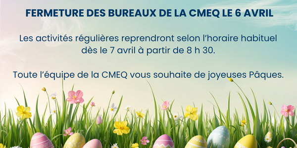 FERMETURE DES BUREAUX DE LA CMEQ LE 6 AVRIL À l’occasion du congé pascal, les bureaux de la CMEQ seront fermés le lundi 6 avril. Les activités régulières reprendront selon l’horaire habituel dès le lendemain, soit le 7 avril à partir de 8 h 30. Toute l’équipe de la CMEQ vous souhaite de joyeuses Pâques.