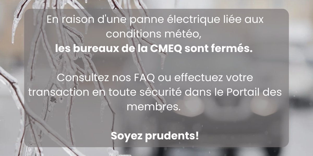 En raison d'une panne électrique liée aux conditions météo, les bureaux de la CMEQ sont fermés.
