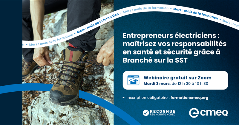 Êtes-vous au clair sur vos responsabilités en SST? Un webinaire d'une heure offert par la CMEQ vous présente l’essentiel. Au menu le mardi 3 mars 2026, de 12 h 30 à 13 h 30 :