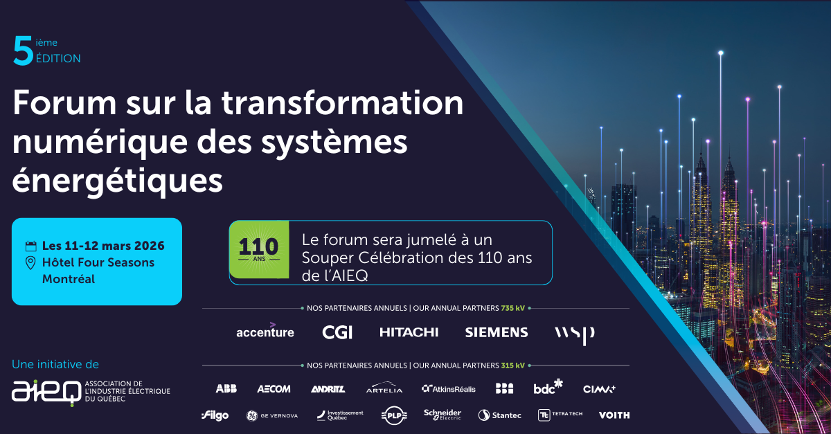Les 11 et 12 mars 2026, le Forum sur la transformation numérique des systèmes énergétiques de l'AIEQ (Association de l'industrie électrique du Québec) revient pour une 5e édition les 11 et 12 mars 2026. L'événement, qui aura lieu au Four Seasons Montréal, se déroulera sous le thème « Prévisibilité, fiabilité et optimisation des réseaux ».